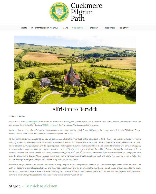The Cuckmere Pilgrim Path is a 14 mile walking route through the South Downs National Park supported by the Heritage Lottery Fund (HLF). To share the route more widely, provide a user-friendly way to navigate the path and to augment the already printed fold-out leaflet, this website is the first stop for pilgrims looking to take the journey. The final development and design includes galleries, GPS map data, an interactive map, downloadable resources and information on the heritage along the way.