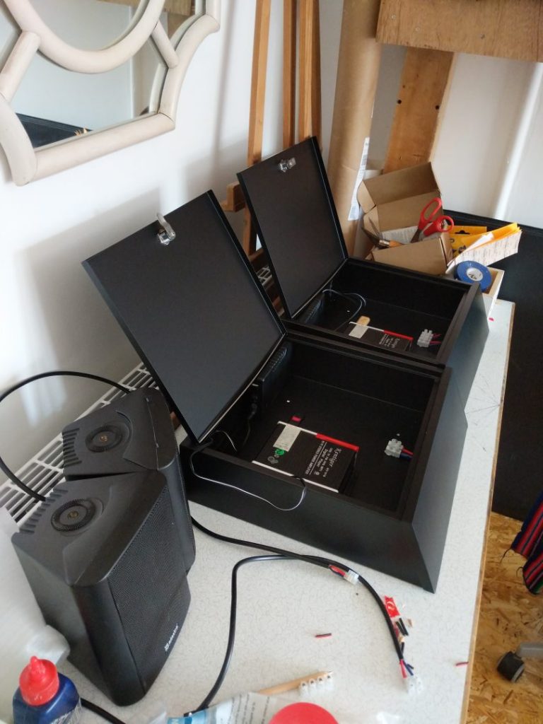 The batteries were 12v lithium 6000mAh packs which had an indicator for the amount of power remaining on them. They drove the amp easily and for those looking after the installation, it was easy enough to take them out of the boxes every few says and give them a charge overnight to keep them running.