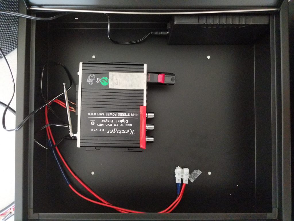 The small amps are perfect for applications like this. They contain a whole host of inputs, can play from a USB or SD card and can auto start on powering up and loop through their tracks. They draw a pretty tiny current too so it meant that they could powered for days from a single battery. These Lepy-style d-class amps are used all over for mini-sound rigs – if you have ever been out on a Critical Mass ride in London, undoubtedly you would have heard one of these rigged up as a sound system.