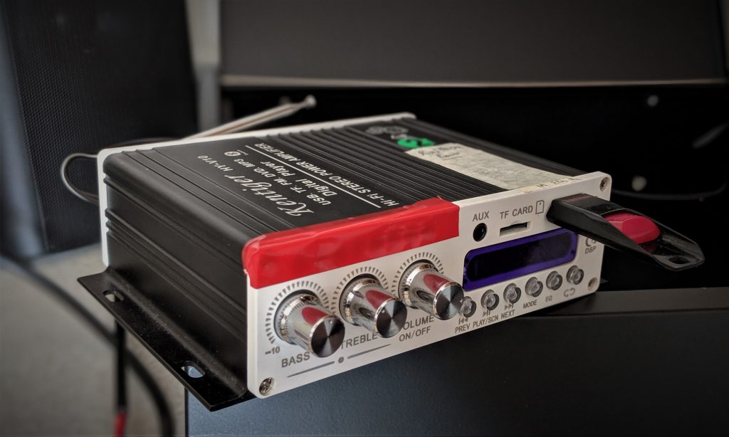 The four installed speakers were weatherproof, two way and 30w. As keeping the power draw to a minimum was essential to eek out of the life of the batteries, I chose the most efficient ones I could find for the price, with SPL at 89db. They came with mounting brackets and switchable impedance and were really versatile in getting them positioned and sounding right.